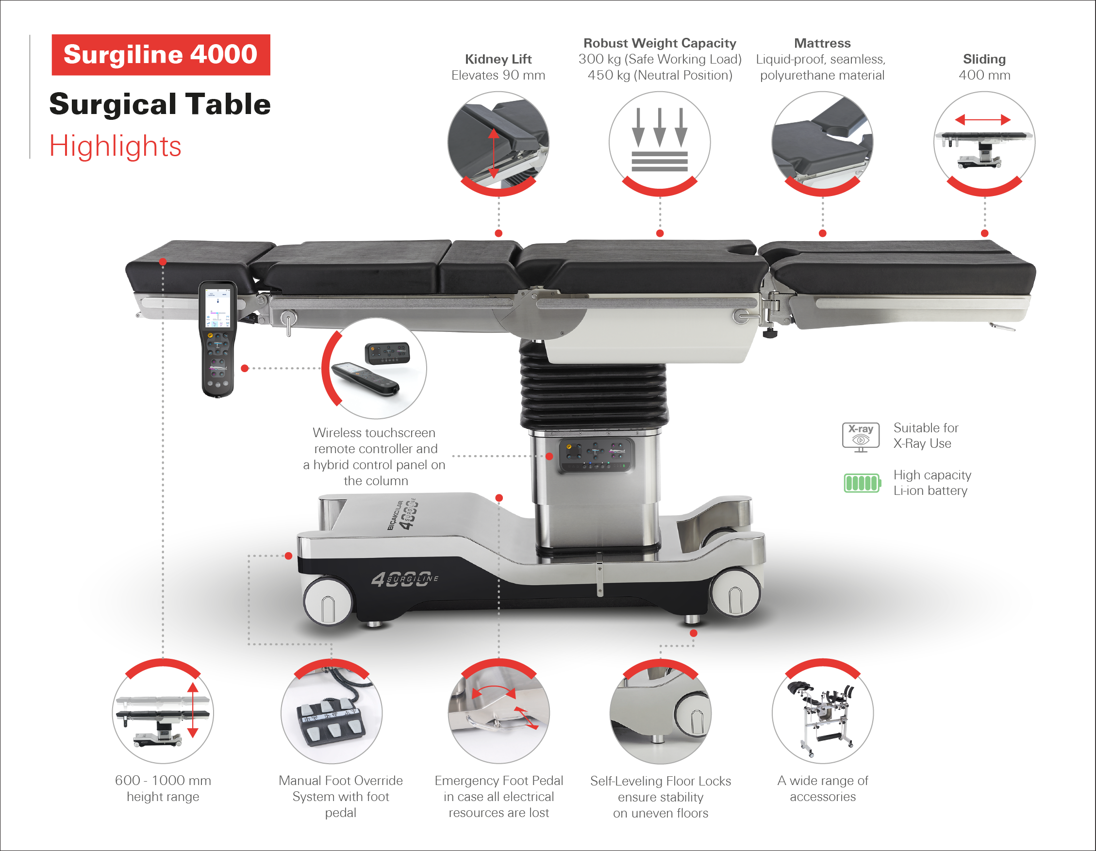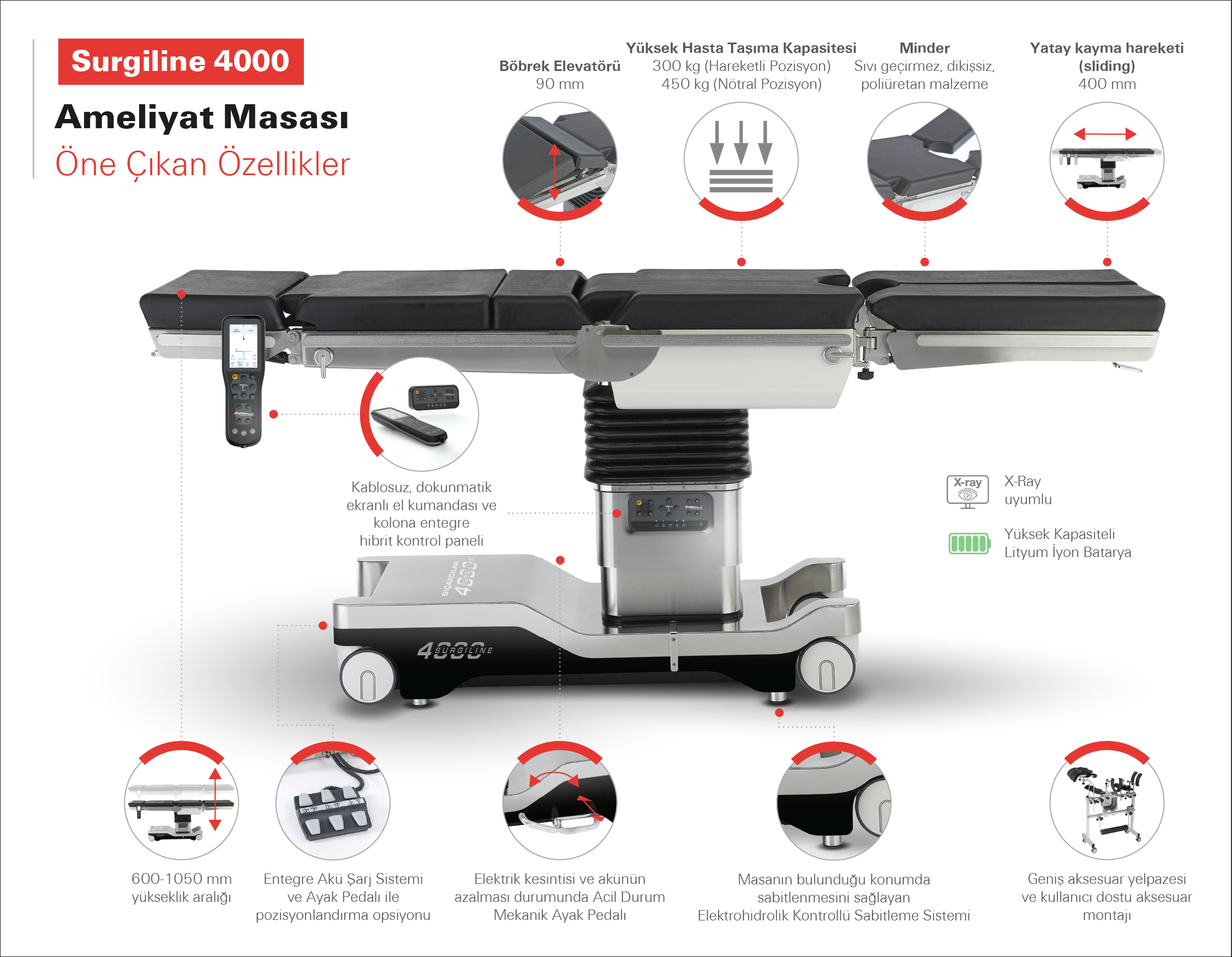Surgiline 4000 Ameliyat Masası, hasta güvenliği özelliklerini yenilikçi teknolojilerle bir araya getirerek, cerrahi uygulamalarda kalitenin artırılmasını amaçlar.